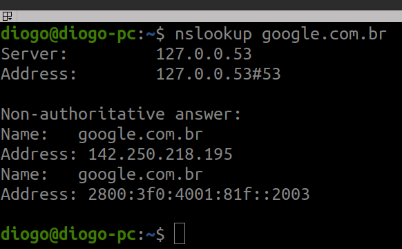 Mostra o endereço IP associado ao nome de domínio do Google.